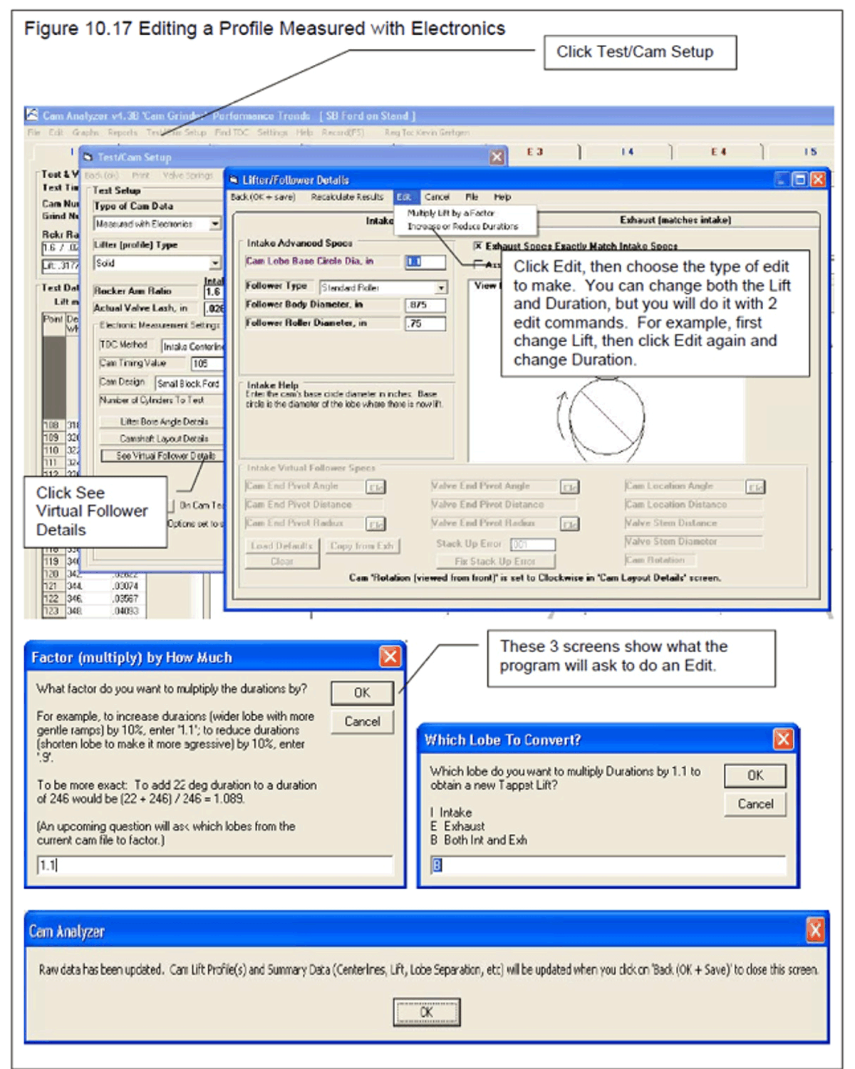 The original Cam Analyzer from 1992 started as a program to record and analyze cam lift data from dial indicator and degree wheel measurements. Once this data is in the computer, you can check the Cam Profile for acceleration rates, lobe centers, Duration at .050", etc. Now you can see if the cam you just installed matches the cam grinder's specs.