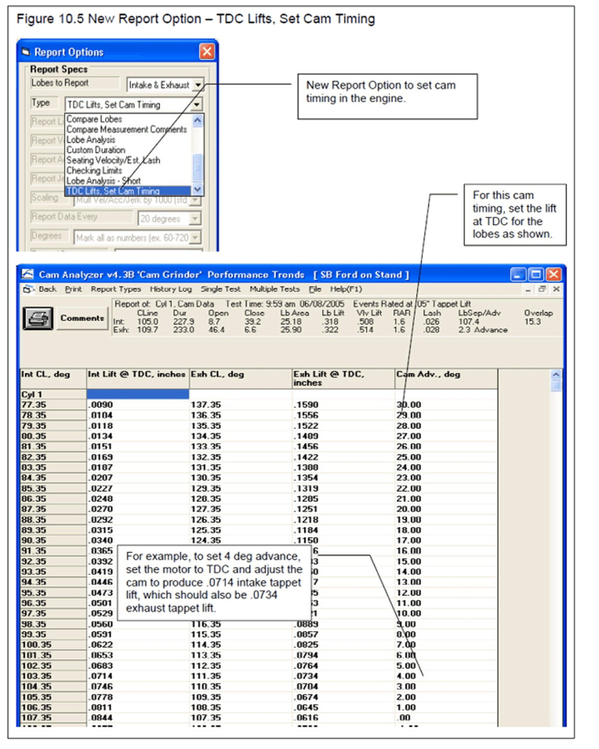 Find TDC following a step-by-step procedure. This procedure's results can be printed separately as a data sheet, very handy for engine builders.